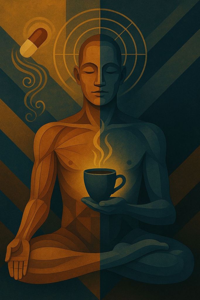 Caffeine engages dopamine and acetylcholine; fasting enhances mitochondrial efficiency. Together they produce not mere alertness but lucidity — the kind that feels like prayer wearing the mask of biochemistry.