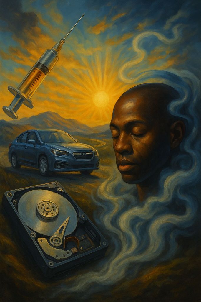 In late sunlight: a Subaru gleams at the curb, its hood lifted like a beast ready for labor. Beside it, a hard drive hums on a desk, while a half-finished plate of food hints at the discipline of fasting interrupted by necessary reward.